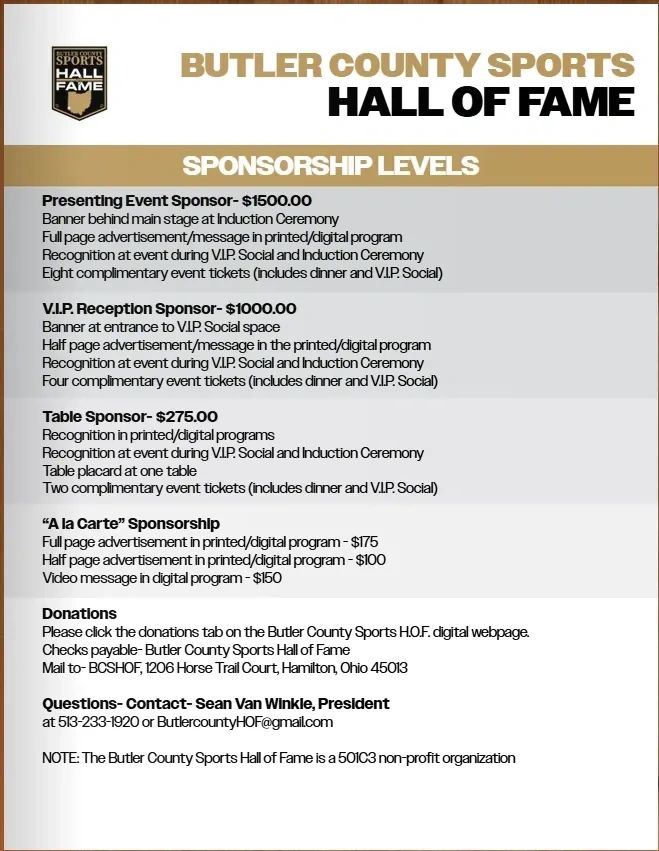 Please consider becoming a Butler County Sports Hall of Fame Sponsor